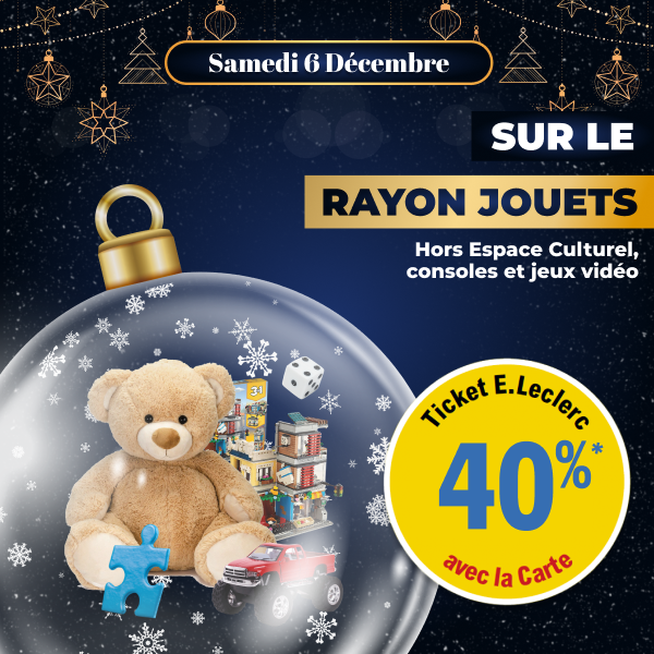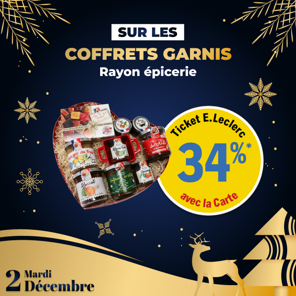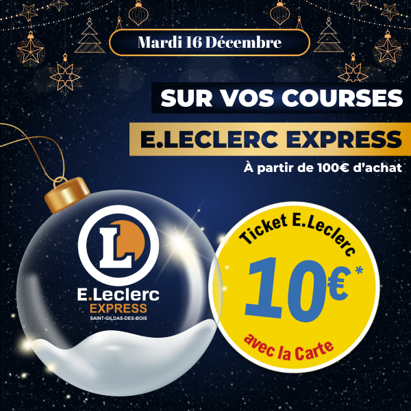 *Offre valable à partir de 100€ d’achat dans votre E.Leclerc Express Saint-Gildas-des-Bois, sous forme de Ticket E.Leclerc, valable à la date indiquée. Offre réservée aux porteurs de la carte de fidélité, 100% gratuite et disponible immédiatement.Voir conditions en magasin.