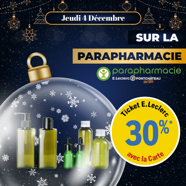 *Offre sous forme de Ticket E.Leclerc, valable à la date indiquée dans votre Parapharmacie E.Leclerc Pontchâteau. Reservée aux porteurs de la carte de fidélité, 100% gratuite et disponible immédiatement. Offre non cumulable avec des produits bénéficiant d’une autre promotion. Voir conditions en magasin.