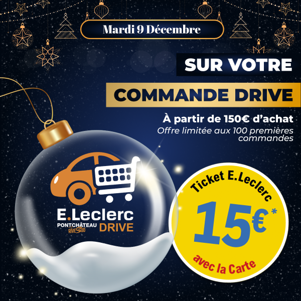 *Offre valable à partir de 150€ d’achat, limitée aux 100 premières commandes. Offre sous forme de crédit sur votre compte Drive, valable à la date indiquée dans votre E.Leclerc Drive Pontchâteau Rive Sud.